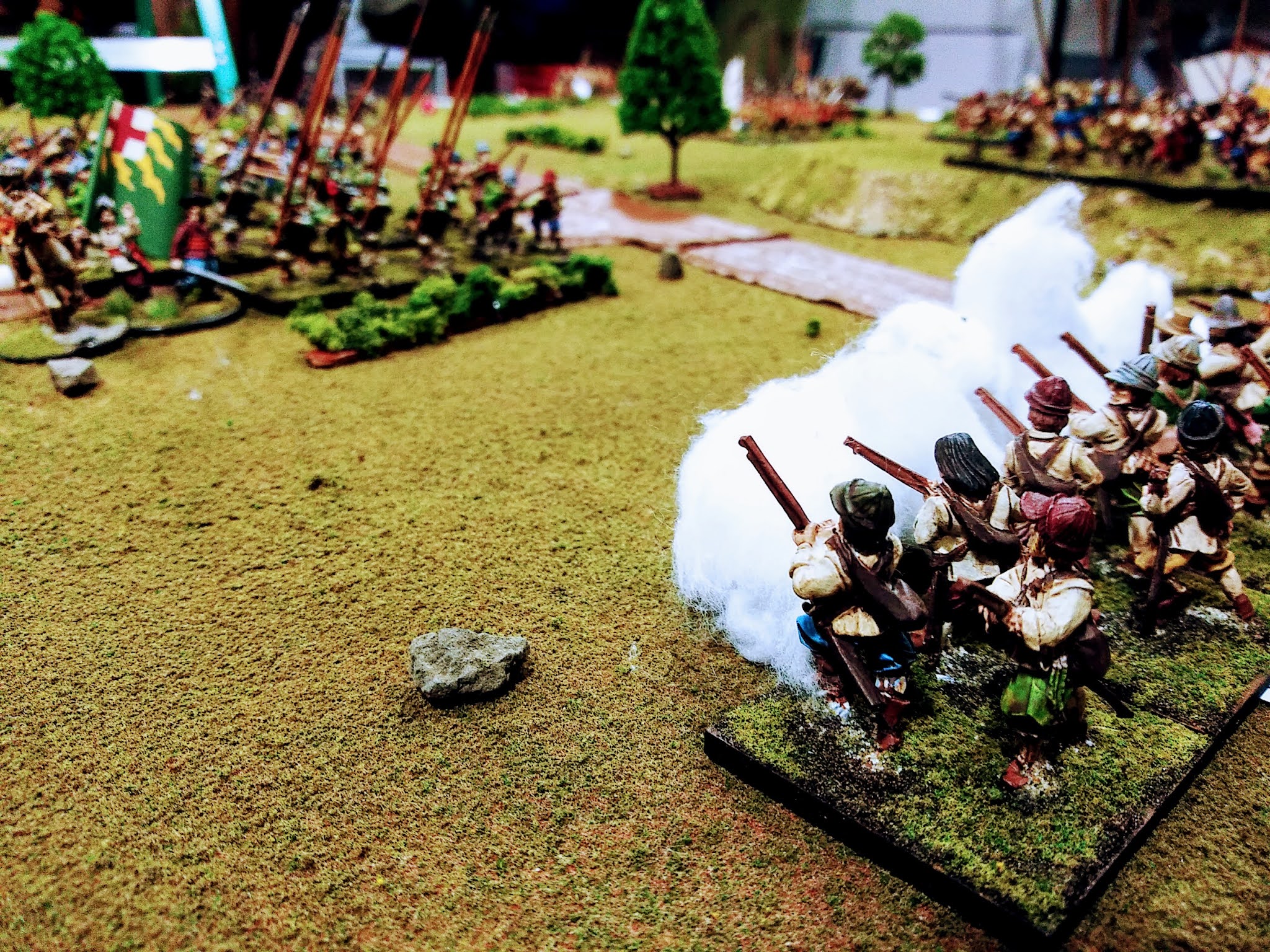 Heavy artillery has a close range of 5 and a long range of 8. Light artillery has a close range of 5 only, but is less effective against fortifications. A gun may not target a town wall if the line of sight is obstructed by an earthwork - it must reduce the earthwork first. At long range, artillery fire is only effective and counts as a "hit" on a natural roll of 6. At short range, a roll of 5+ is effective. A gun may not fire if was moved the previous turn. Modifiers to hit are as follows: +1 if gun is shooting at same target as previous turn.